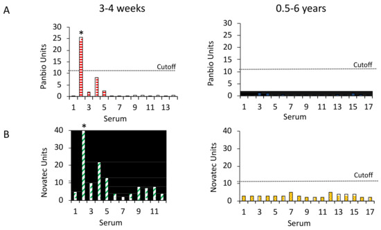 Panbio and NovaLisa Dengue IgG ELISA reactivity with sera from JEV-vaccinated individuals. (A) Panbio and (B) NovaLisa ELISA units with sera from 3–4 weeks (N = 14 and 12, respectively) and 0.5–6 years (N = 17) after JEV vaccination. The cut-off for positive sera is 11 assay units. Asterisks indicate the serum that neutralized DENVs.