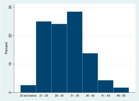 A total of 116 respondents answered the online survey. The majority (53.4%) were from the NCR, 34.5% were from northern and southern Luzon, and 12.1% were from Visayas and Mindanao (Table 2 and Figure 1). The Study participants were 18 to 50 years old (Figure 2) with a mean age of 30.25 years old (SD = 6.22), and 91.3% were 21 to 40 years old. Respondents were mostly males (95.7%), were either homosexual (59.5%) or bisexual (37.9%), had college or graduate degrees (87.1%), and were employed (70.7%).
