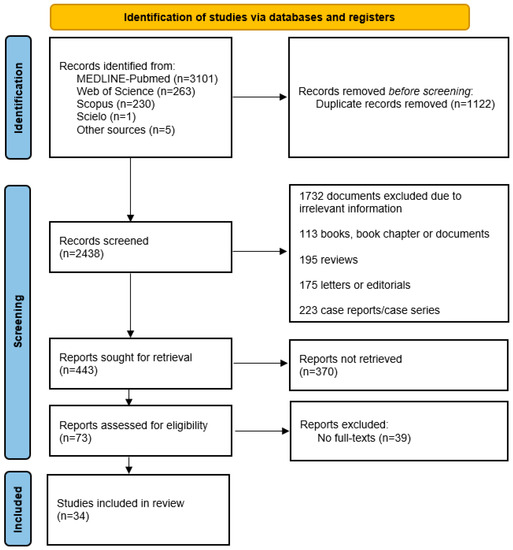 At the end of the database search, along with reverse searching based on article references, 3600 manuscripts were obtained. The distribution was as follows: Medline/PubMed contained 3101 texts, Web of Science had 263 texts, Scopus contained 230 texts, Scielo contained 1 text, and 5 texts were obtained through reverse searching. The review process involved discarding duplicates, screening titles and abstracts, and concluding with full-text reading. Ultimately, this systematic review included 34 articles [7,10,11,12,16,17,18,19,20,21,22,23,24,25,26,27,28,29,30,31,32,33,34,35,36,37,38,39,40,41,42,43,44,45] (Figure 1).