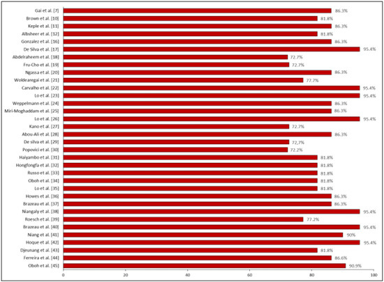 Percentage of compliance with reporting quality according to the STROBE tool [7,10,11,12,16,17,18,19,20,21,22,23,24,25,26,27,28,29,30,31,32,33,34,35,36,37,38,39,40,41,42,43,44,45].