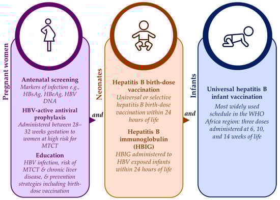 Safe and effective strategies are available for prevention of HBV MTCT to neonates and infants from as early as the in-utero stage, as shown in Figure 2. Antenatal screening has the advantage of identifying those at risk for HBV MTCT who can then be timely linked to appropriate care such as HBV-active antiviral prophylaxis [47]. During antenatal visits, pregnant women should also be provided with information on HBV infection, the lifetime risk for chronic liver disease associated with HBV MTCT, and the prevention strategies available to them and their babies including hepatitis B birth-dose vaccination [23,47]. Unfortunately, for some African countries, antenatal screening for HBV infection can be expensive and impractical if laboratory facilities are not situated close to antenatal clinics [23,47]. Despite this, the feasibility of antenatal screening for HBV infection has been proven in South Africa [15], and cost-effectiveness has been demonstrated in Namibia as part of the national HBV MTCT prevention package [3]. Maximum gains can be achieved if HBV antenatal screening is integrated with existing HIV and syphilis point-of-care testing infrastructure [15,55].