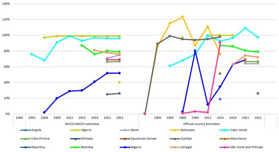 WHO/UNICEF (left) and official country (right) estimates of hepatitis B birth-dose vaccination coverage (2000–2022) [21,62].