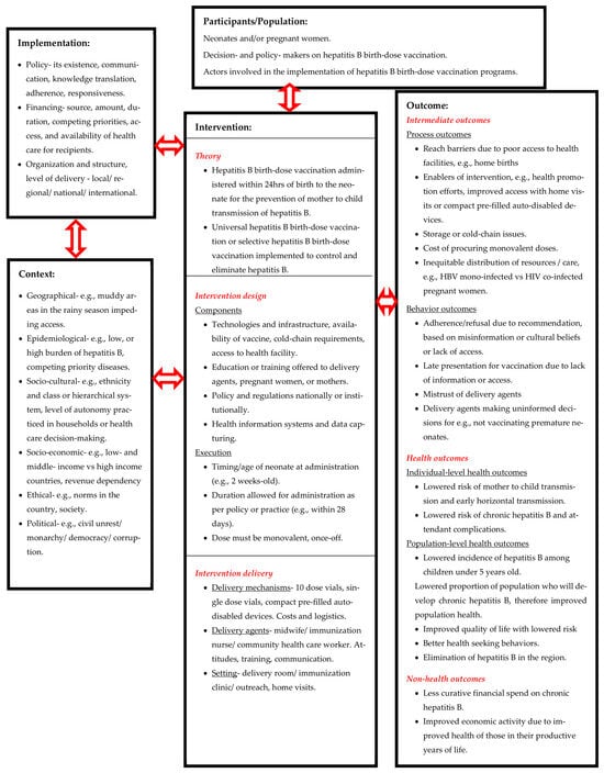 We propose a systems-based logic model for understanding the role of complexity within hepatitis B birth-dose vaccination programs and the health systems that deliver them (Figure 5). This model is an adaptation of the template designed by Rohwer et al. for systematic reviews of complex interventions and builds on previous related frameworks [92,93,94]. It depicts the system in which interactions among the participants, the intervention (hepatitis B birth-dose vaccination), and the context take place [92]. The intervention is divided into theory, design, and delivery, with the expansion of these subcomponents into key aspects like process of execution, delivery mechanisms, and agents. Program implementation requires details on policy, financing, providers, organization, and structure, while context requires the description of the geographical, epidemiological, socio-cultural, socio-economic, ethical, legal, and political landscapes. Finally, outcomes are categorized into short, intermediate, and long term, with consideration for the nature of these outcomes [92]. Further description of the allocation of factors in the model can be found in Box 1. Application of this model in future evidence syntheses on hepatitis B birth-dose vaccination programs in the African region may provide a means of conceptualizing complexity and system-wide effects, making findings more accessible to a broad range of decision- and policy-makers [92].