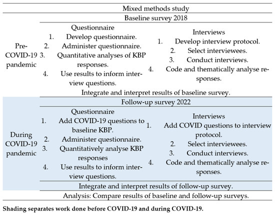 This study used a mixed methods design. Data collection included two components: (i) a quantitative KBP questionnaire which included both closed and open-ended questions, and (ii) face-to-face and telephone interviews. The rationale for using a mixed methods design was to provide participants with the opportunity to add clarification and explanation to the quantitative questionnaire responses [20,21].