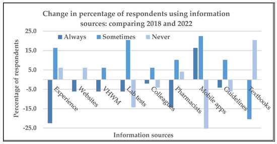 Change in percentage of respondents using the information sources included on the knowledge, beliefs, and practices (KBP) questionnaire about Ni-Vanuatu health workers’ KBP regarding antibiotic prescribing and antibiotic resistance, and the influence of the COVID-19 pandemic: 2018 compared with 2022.