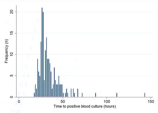 There were 193 bacteraemic patients who had their initial blood cultures collected at Cairns Hospital. The median (IQR) TTP was 31 (26–39) hours (Figure 1). There was no change in the TTP over the course of the study period (p for trend = 0.43). In the first 5 years of the study period, the median (IQR) TTP was 33 (24–73) hours, compared with 30 (20–37) hours in the last 5 years of the study. There were 21/193 (11%) patients with positive blood cultures within 24 h, while 171/193 (89%) and 189/193 (98%) had positive blood cultures within 48 h and 72 h, respectively (Table 2). Patients with positive blood cultures within 24 h were 11 times more likely to die than patients whose blood cultures flagged positive later (OR (95% CI): 11.05 (3.96–30.83), p < 0.0001).