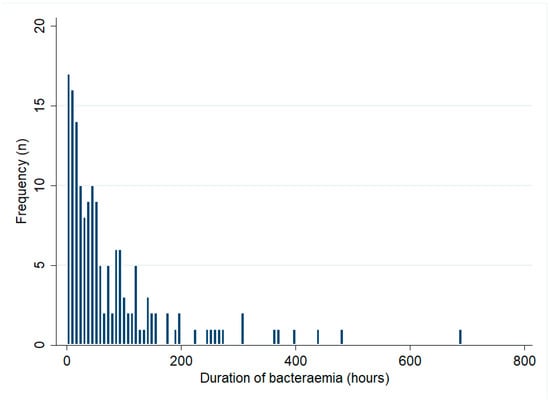 Duration of bacteraemia among patients with multiple positive blood cultures (only patients who survived to hospital discharge are shown).