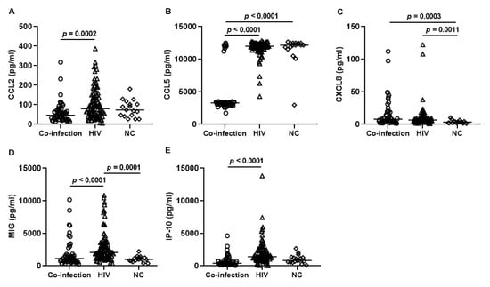 Comparison between serum chemokine levels in 53 co-infected patients, 90 HIV, and 17 negative control (NC). Kruskal–Wallis test, followed by the Dunn’s post-test; median and interquartile range. Concentrations (pg/mL) of (A) CCL2; (B) CCL5; (C) CXCL8; (D) MIG; (E) IP-10. Significant differences expressed with p-value.
