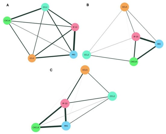Correlation networks of serum chemokines between co-infection (A), HIV (B), and NC (C). The networks were constructed based on Spearman r scores between chemokines, with nodes representing the chemokines CCL2, CCL5, CXCL8, MIG, and IP-10, and edges representing the correlations between them. The edges were weighted based on the correlation values. Thus, weak correlations (r < 0.4) are represented by thin gray gradient lines and moderate correlations (r = 0.4 to 0.6) and strong correlations (r = 0.7 to 0.9) are represented by thick black lines between attribute pairs.