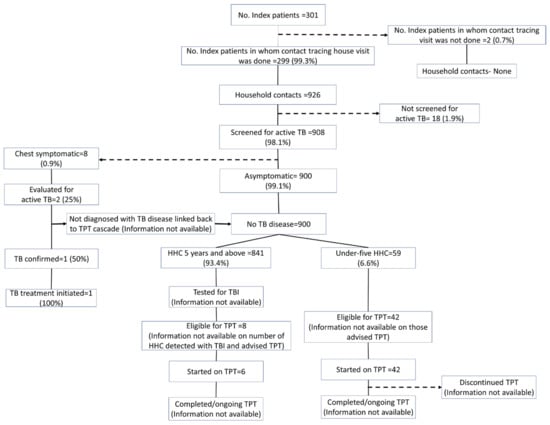 Using the programmatic data, the contact tracing and TPT cascade of the 301 TB index patients and their contacts is provided in Figure 1.