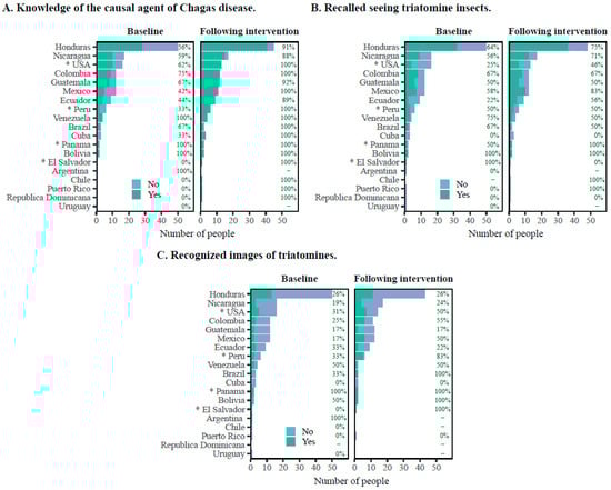 Participant responses to survey questions at baseline and following educational intervention by country of birth. (A) General knowledge about Chagas disease. (B) Recalled seeing triatomine insects. (C) Recognized at least one image of a triatomine. Data are presented as the number of participants and percentage. * Countries that have never had a national program for the control of Chagas disease.