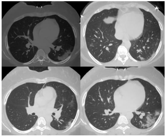 - Bernheim, A.; Mei, X.; Huang, M.; Yang, Y.; Fayad, Z.A.; Zhang, N.; Diao, K.; Lin, B.; Zhu, X.; Li, K.; et al. Chest CT Findings in Coronavirus Disease-19 (COVID-19): Relationship to Duration of Infection. Radiology 2020, 295, 200463. [Google Scholar] [CrossRef]
