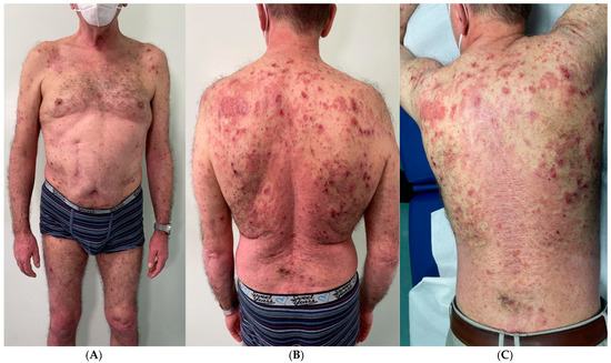 Here we report the case of a 61-year-old patient who presented at our clinic with a diffuse psoriasiform eruption mixed with a concomitant blistering rash suspected to be induced by COVID-19 (Figure 1). The patient’s medical history was negative except for the presence of mild psoriasis for 10 years, localized mainly to the lumbar region and elbows, which was well controlled with topical calcipotriol and betamethasone. He was taking no other medications. Prior to the visit to our hospital, the patient reported that he contracted COVID-19 (D0). The infection lasted 10 days asymptomatically and without taking any medication. A molecular swab on day 10 was negative (D10). He presented the negative swab seven days after (D17) with a severe worsening of psoriasis, with plaques that involved the entire dorsal region and extended to the upper and lower extremities (PASI 15.2 and BSA 24%). The patient had been vaccinated against COVID-19 infection with three doses of the Moderna mRNA-1273 vaccine. The vaccination had been completed about three months before the COVID-19 infection described.
