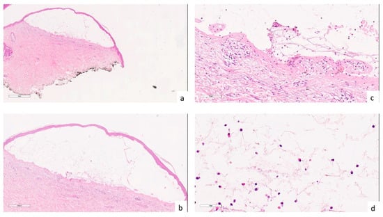 (a,b) Histologically, a subepidermal bullous lesion is observed ((a) hematoxylin-eosin, 2×; (b) hematoxylin-eosin, 4×); (c) Drawing of the dermal papillae on the bulla floor (hematoxylin-eosin, 20×); (d) at higher magnification, the bulla content consisting of fibrin and a modest cellular component, including an appreciable proportion of eosinophils, is apparent (hematoxylin-eosin, 40×).