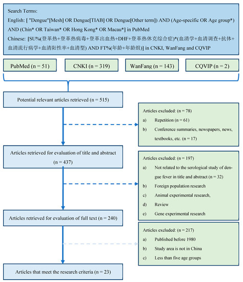 We searched multiple literature databases for potentially available studies related to dengue serology in China. Since we mainly studied the spread of dengue in China in recent years, articles published before 1980 and articles whose study areas are not in China were excluded. Since a wider age group may not accurately reflect the difference in the seropositivity rate of the age group [19], the studies that had at least five age groups were included. Based on these selection criteria (Figure 1), 23 studies [23,24,25,26,27,28,29,30,31,32,33,34,35,36,37,38,39,40,41,42,43,44,45] were finally included (Supplementary File S1).