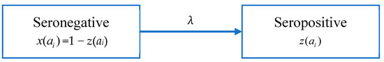 According to Muench’s catalytic model [48], people in age group i changes from a seronegative group to a seropositive group after infection at a rate λ, as shown in Figure 2. Here λ is used to denote FOI, and the proportions of seronegative and seropositive in the age group i are x(ai) and z(ai), respectively.