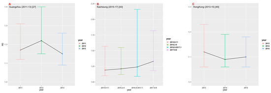 Among 23 studies selected for this analysis, only three studies provided multiple years of data. We estimated FOI and R0, respectively, by using their best models in different years (Figure 6). In the study conducted in Guangzhou [27] from 2011 to 2013, the estimate of R0 in 2012 was the largest (1.22, 95% CrI: 1.15, 1.40). In the study [43] conducted in Kaohsiung from 2015 to 2017, the estimate of R0 showed an upward trend, with R0 = 1.33 (95% CrI: 1.18, 1.82) for the data set collected in August-September 2017. In the study [45] conducted in Hong Kong between 2013 and 2015, R0 was estimated to be the largest in 2013 (1.12, 95% CrI: 1.06, 1.23). Figure 6 shows that there appears to be no significant time change trend in dengue transmission intensity in the three study areas.