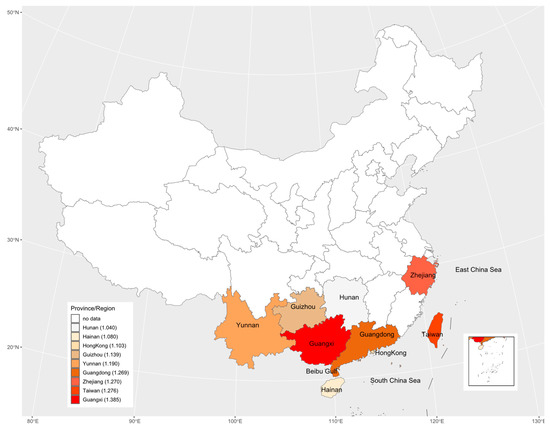 The 23 studies involved eight provinces and one region in China, namely Guangdong, Guangxi, Zhejiang, Hunan, Guizhou, Hainan, Yunnan, Taiwan and Hong Kong, with a total of 18 study regions and 31 data sets (Table 1). They are all located south of the Yangtze River in China. Among them, Guangdong, Guangxi, Zhejiang, Hainan, Taiwan and Hong Kong are all coastal provinces, while Hunan, Guizhou and Yunnan are inland provinces. In addition, Yunnan Province and Guangxi Province are adjacent to Southeast Asian countries. Most of the eight provinces or regions are located between 20° and 30° north latitude, with tropical or subtropical seasonal characteristics, high temperature and humid climate.