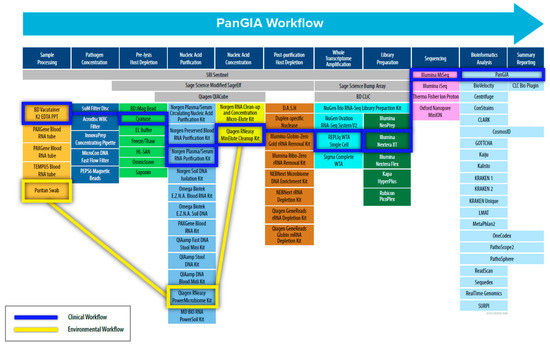 To address these challenges, we adopted a “Best-of-Breed” approach to identify, evaluate, and select commercial-off-the-shelf (COTS) technologies and products to use in the PanGIA (Pan-Genomics for Infectious Agents) final workflow (refer to Figure 1). We evaluated 79 technologies for the proposed workflow, encompassing sample pre-processing, pathogen concentration, pre-lysis host depletion, total nucleic acid purification, total nucleic acid concentration, whole transcriptome amplification, post-purification host depletion, library generation, next-generation sequencing, and bioinformatics analysis. The work presented here details our development of a separate clinical workflow (intended for use with clinically relevant matrices such as whole blood, plasma, serum, and saliva.) and environmental workflow (intended for use with environmental samples such as swabs, soil, wastewater, etc.). Our initial development focused on using whole blood for bloodstream infections and environmental swabs in our developed workflow as sample inputs. The work presented here is offered as an unbiased solution for pathogen detection for infectious disease and biosurveillance applications, with future goals of integrating additional relevant sample types.