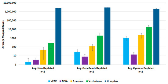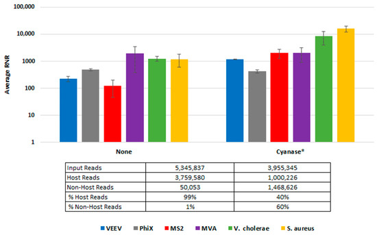 To demonstrate Cyanase dehosting in whole blood, we spiked samples with S. aureus, MVA virus, VEE virus, and V. cholerae. Figure 3 shows the RNR for each species in the presence or absence of Cyanase. In the presence of Cyanase, there is an approximately 10-fold increase in the RNR value for S. aureus, VEE virus, and V. cholerae, while there is no difference in RNR for the MVA virus. Figure 3 shows the number (and percentage) of host and non-host reads detected in the presence or absence of Cyanase. In this study, there was an average reduction of 2.76 million (58.7%) host reads and an average increase of 1.42 M non-host reads, up from an average of 1.3% non-host reads without Cyanase to 60% non-host reads with Cyanase.