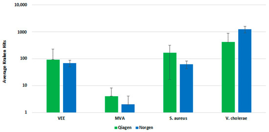 Figure 5. Clinical Extraction Kit Comparison. This figure illustrates the average number of Kraken hits for n = 3 replicate extraction reactions with the Qiagen and Norgen extraction kits.