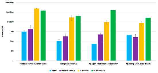 Figure 6. Environmental Extraction Kit Comparison. This figure illustrates average RNR values for four pathogen surrogates (VEE virus, Vaccinia virus, S. aureus, V. cholerae) for four different extraction kits.