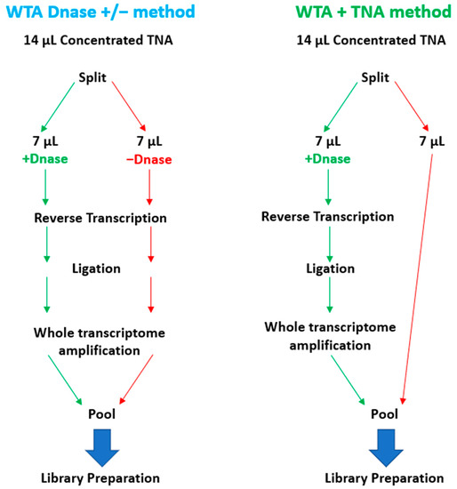 For the “WTA/TNA” method, REPLI-g WTA Single Cell Kit (Qiagen) was used to perform first strand cDNA generation and whole transcriptome amplification (WTA) with 7 µL of concentrated TNA, according to the protocol for “Amplification of Purified RNA” [22]. Following WTA, PCR clean-up was performed using Agencourt AMPure XP beads (Beckman Coulter, Brea, CA, USA) [22]. For the “WTA DNase +/−” method, we performed the REPLI-g WTA Single Cell Kit “Amplification of Purified RNA” protocol twice on each sample: one-half of the sample volume was processed exactly according to protocol; the other half without DNAse treatment.