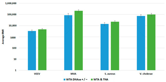 We compared both WTA approaches with our clinical and environmental sample preparation workflows, as shown in Figure 8 and Figure 9, respectively. In most cases, there was no statistically significant difference in detection of our targets with whole blood. For Vaccinia, we noted a statistically significant 2-fold increase in RNR value for the clinical workflow. There was a statistically significant increase in RNR for the environmental workflow with the WTA & TNA Method versus the WTA DNase ± method for all targets, except for VEE virus. Given these findings, we incorporated the WTA & TNA method into our workflow to reduce unnecessary sample handling and reagent costs.