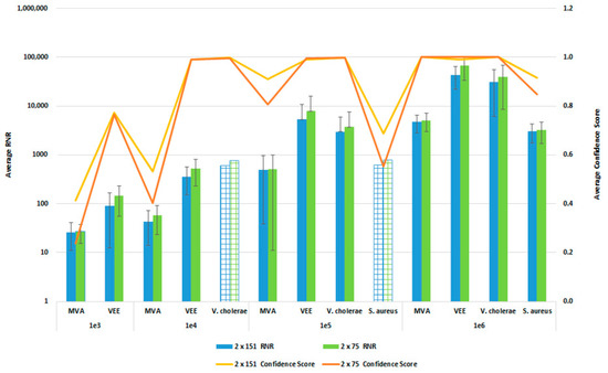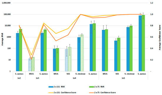 In order to reduce the turnaround time from sample-to-answer, we investigated the use of a 2 × 75 paired end sequencing run versus the 2 × 151 paired-end protocol that we used during the initial development of the workflow. While the 2 × 75 paired-end protocol provides a reduction in 12 h of sequencing time, we were concerned about the potential for reduced detection sensitivity and specificity with the shorter sequencing run due to the potential impact on resulting confidence scores. For this comparison, whole blood was co-spiked with internal positive controls (MS2 and PhiX bacteriophages), and four pathogens, S. aureus, MVA virus, VEE virus, and V. cholerae. All four pathogens were co spiked into 1 mL of whole blood at serial dilutions of 1 × 106, 1 × 105, 1 × 104, or 1 × 103 CFU/PFU per mL. Four samples for each spike level were processed using the PanGIA Clinical Workflow and ran using a 2 × 75 or 2 × 151 sequencing run. Using statistical analysis, we determined that there was no significant difference in the RNR values and confidence scores between the sequencing run parameters for these samples (Figure 10). This is true for the Environmental Workflow as well, where we co-spiked internal positive controls with four pathogen surrogates at 1 × 105, 1 × 104, 1 × 103, and 1 × 102 CFU/ PFU (Figure 11). Therefore, we chose 2 × 75 sequencing runs as the standard protocol, which saves approximately 12 h of processing time and enables a sample-to-answer in under 24 h. Additional data for all other spike levels can be found in Tables S2and S3. Based on the acceptance criteria of a minimal average RNR score of 100 and an average Confidence Score of 0.5 for all four technical replicates, we were able to determine notional Limits of Detection (LoD) for our target organisms. We calculated LoDs with the clinical workflow of 1 × 105 CFU, 1 × 106 CFU, 1 × 105 PFU and 1 × 104 PFU for V. cholerae, S. aureus, MVA virus, and VEE virus, respectively (Figure 10). For the environmental workflow, we detected all four targets at 1 × 105 CFU or PFU (Figure 11).