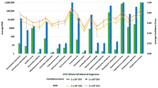 Figure 12. Inclusivity of ATCC Whole Cell Material Microbiome Standard—Whole Blood. This figure summarizes the average RNR and Confidence Scores based on 4 of 4 contrived, whole blood replicate samples. Bars represent sample confidence scores, and lines represent sample RNR values. At 1 × 105 CFU/ mL, the following were detected with less than 4 replicates: C. acnes (3), P. gingivalis (3), B. vulgatus (2), C. beijerinckii (2), N. meningitides (2), R. sphaeroides (2), H. pylori (1), P. aeruginosa (1).