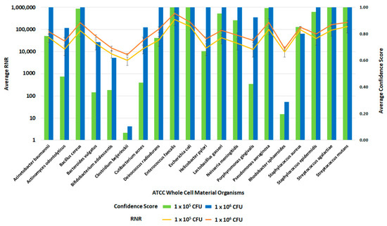 Following the optimization of the clinical and environmental workflows, we sought to verify the system’s general ability to detect pathogens. For this evaluation, we spiked whole blood and RBM swabs with the ATCC 20 Strain Even Mix Whole Cell Material (ATCC MSA-2002), a microbiome standard that consists of 20 gram-positive and gram-negative bacteria in equal concentrations. Clinical and environmental samples were spiked with MSA-2002 at concentrations of 1 × 106, 1 × 105 or 1 × 104 CFU of each organism and processed using the respective workflows. The 1 × 106 and 1 × 105 CFU organism results of these studies are presented in Figure 12 and Figure 13. Testing the microbiome standard enabled the evaluation of a diverse mixture of 20 gram-positive and gram-negative bacteria. Figure 12 and Figure 13 demonstrate the detection of reads for all twenty organisms in whole blood and RBM, respectively. We noted a difference in performance of the microbiome standard in our two sample matrices as it related to RNR and confidence score values. Overall, the confidence scores for the twenty organisms were much lower in whole blood versus the RBM swabs. This difference in performance may be due to the high-host background nature of clinical samples. These results show that the presence of host genomic material affects the metagenomic detection sensitivity of pathogens.