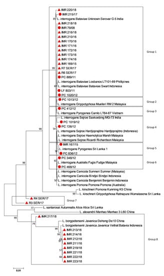 Based on our results, L. interrogans was shown to be the main infecting Leptospira species in humans, with a broad range of infecting serogroups (Figure 1). Among these commonly identified serogroups in Malaysia, the most predominant serovars in humans were Bataviae and Sejroe (Figure 1). Interestingly, in the northeastern state of Malaysia, Shafei et al. [38] reported two predominant serogroups, Javanica and Bataviae, among town service laborers. Conversely, Rafizah et al. [39] reported the serogroup Sejroe as the common serogroup detected in febrile inpatient cases. Additionally, two samples of group 7 (R3_SER/17 and R4_SER/17) were not closely related with any of the reference strains based on the alignment of concatenated sequences of MLST Scheme 3 (Figure 1). This is because information on reference strains in the MLST database is limited to L. interrogans and L. kirschneri [16] and no allelic profiles have been assigned to new leptospiral strains. Furthermore, concatenated sequences of R3_SER/17 and R4_SER/17 might be unique with allelic variation at each locus, hence unable to find the exact/nearest match when compared with the database.