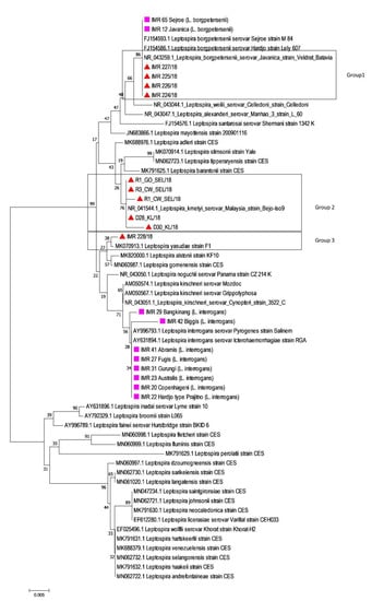 - Bahtiar Affendy, N.; Mohd Desa, M.N.; Amran, F.; Sekawi, Z.; Masri, S.N. Isolation and molecular characterization of Leptospira interrogans and Leptospira borgpetersenii from small mammals in Selangor wet markets. Int. J. Infect. Dis. 2020, 101, 534. [Google Scholar] [CrossRef]