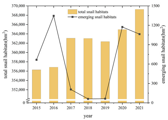 From 2015 to 2021, the total area of snail habitats distributed in YEB increased from 356,279.57 hm2 to 369,244.05 hm2, with an increase of 3.65%. Classified by the ecotype of the snail habitats, 94.72% of the snail habitats (349,737.78 hm2) were distributed in marshland and lake regions, 5.19% of them (19,156.73 hm2) were located in hilly and mountainous regions, while the others were in waterway network regions in 2021 [27]. The area of emerging snail habitats increased from 666.04 hm2 to 1063.08 hm2 from 2015 to 2021, with high values mainly occurring in 2016, 2020 and 2021 (Figure 2). Infected snails were only found in 2020 in the Guichi District of Anhui Province, in an area of 1.96 hm2.