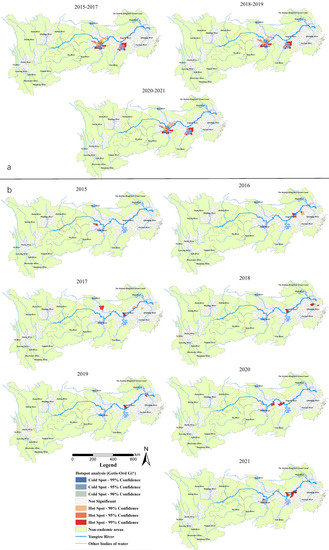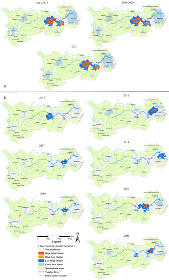 (a) Total area of the snail habitats; (b) emerging snail habitats. Clusters and outlier areas of snail habitats in the endemic areas in the YEB, 2015–2021.