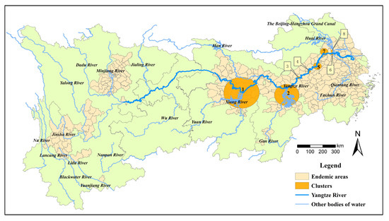Comparing the clusters presented by Kulldorff’s space–time scan statistic with the results of hotspot analysis, we found that the distribution of the hotspots was similar to that of the long-duration cluster circles in the space–time scan, indicating that the distribution of the snails in endemic areas in the YEB may not be random. The primary and secondary spatial and temporal clusters were concentrated in the meadow of a lake along the middle reaches, including a total of 44 counties (cities, districts), and 8 (Duchang, Yongxiu, Poyang, Pengze, Yugan, Nanchang counties and Lushan, Gongqing cities in Jiangxi Province) of them were still at the transmission control stage. In addition, the left clusters in the lower reaches included Daguan District and Dongzhi County in Anhui Province, which were also at the stage of transmission control. Due to the slow declining trend in areas of snail habitats and the great difficulties in the eradication of snails in these counties, where snails were mainly distributed on river or lake beaches, the main targets of countermeasures should be to reduce the density of snails and prevent snail spreading from embankments to production areas or living areas, that people or livestock often visit, by hardening the snail habitats, improving the watershed management and designing land consolidation projects, in combination with efficient snail control [52,53]. For complex environments such as hills and mountains, attention should also be paid to the sequential implementation of snail control (e.g., from the surroundings to the center, from high altitude to low altitude in the dam area). Moreover, surveillance should be strengthened and maintained in areas where snails have been eliminated, with no clusters detected in the upper and lower reaches, especially after the occurrence of torrential floods or earthquakes.
