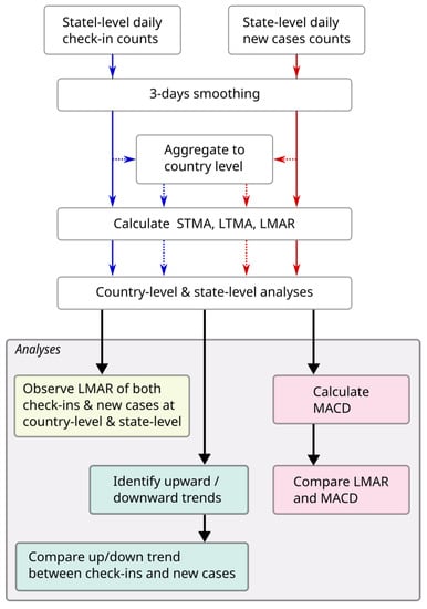In this study, two scales of analysis were performed, i.e., the country level (Malaysia as a case study) and the state level (16 states, each as a case study). For each of the case studies, LMAR was calculated for both daily check-in counts and new case counts, and the two calculation results were compared to discuss the relationship between human activity intensity and the disease situation. Following the analyses of the two different scales, we performed the two comparison analyses, including the comparison with MACD and the comparison of the up and down trends between the case counts and check-in counts. In this study, for consistency purposes, the MACD was calculated as Equation (5), which used the 7-day and 56-day simple moving averages instead of the 12-day and 26-day exponential moving averages.