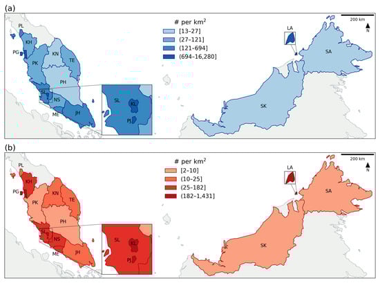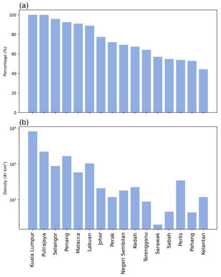 The study area was set to be Malaysia, a Southeast Asian country composed of two parts: West Malaysia (also known as Peninsular Malaysia, which shares a border with Thailand in the north and is connected to Singapore across the Johor Strait), and East Malaysia (part of the island of Borneo). In this study, two spatial levels were analyzed, including the country level and the states and federal territories (hereafter, state level). A total of 16 states or federal territories (FTs) are in Malaysia, 13 of which are located in West Malaysia: on the west coast, from north to south: Perlis (PL), Kedah (KH), Penang (PG), Perak (PK), Selangor (SL), FT Kuala Lumpur (KL), FT Putrajaya (PJ), Negeri Sembilan (NS), Malacca (ME), and Johor (JH); on the east coast, Kelantan (KN), Terengganu (TE), and Pahang (PH). The other three states are located in East Malaysia, including Sabah (SA), Sarawak (SK), and FT Labuan (LA). Figure 2 shows the demographic information, including the urban population percentage and population density of the 16 states, sorted by the urban population percentages [].