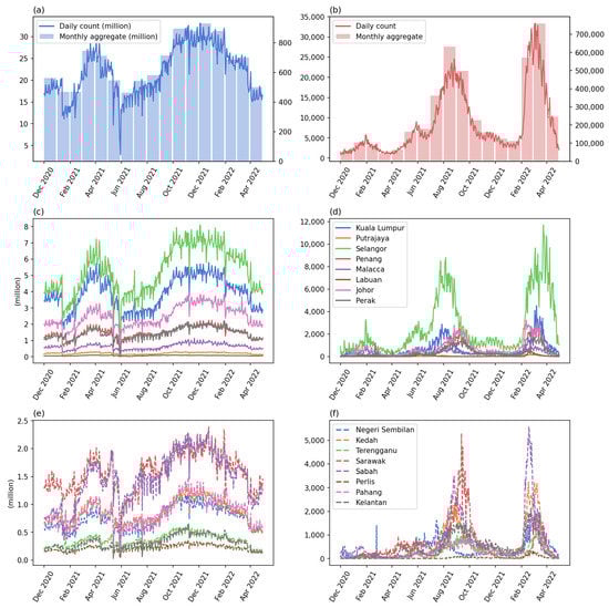 As aforementioned, the datasets were provided by the Ministry of Health, Malaysia under an open data license (https://github.com/MoH-Malaysia/covid19-public, accessed on 28 October 2022). Two main datasets were used: (1) the daily check-in counts for each state and (2) the daily new case count for each state. Both datasets were publicly available on the aforementioned repository. Figure 4 shows the daily or monthly trend of the aggregated and individual state count of the two datasets. From the right column (new case count), the two waves of COVID-19 can be observed, the Delta variant that peaked in August 2021 and the Omicron variant that peaked in March 2022.