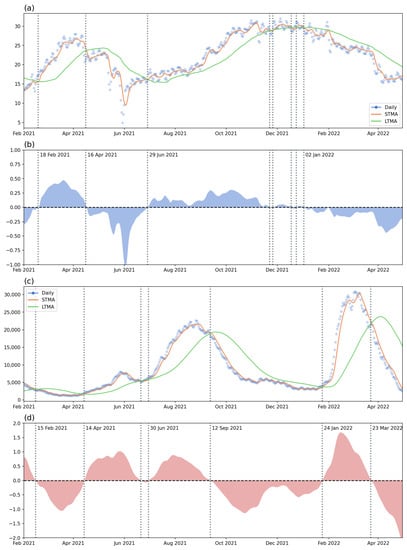 Time series models had been used in the analysis of COVID-19 studies, including the autoregressive integrated moving average model [,], statistical neural network model [], long short-term memory model [] and Gaussian process regression model []. A concept from the analysis of the trading indicator—moving average convergence/divergence (MACD)—can be adopted. MACD is an indicator comparing the short-term moving average (MA) to the long-term trend (MA) []. The crossings—also known as golden and death crosses—indicate the upward and downward trends (respectively) of the short-term moving average crossing the long-term moving average values. In other words, the long-term moving average value shows the relatively stable and balanced level of the trend line, whereas the short-term moving average represents the current tendency of the situation. Thus, the upward and downward crosses of the short-term trend line on the long-term trend line raise the signals of important changes in the situation. Since the COVID-19 waves have a different baseline, the comparison between short-term MA and long-term MA can show a pattern that presents the up and down trending of the recent situation. This is because short-term MA is more sensitive to the recent development of the situation, whereas long-term MA can reflect the new baseline of the cases. Thus, comparing short-term and long-term MAs can hint at when the disease cases begin to surge and drop.