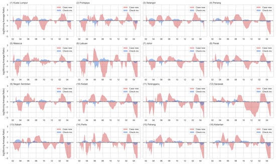 Overall, LMAR and MACD yield similar trends in each case for both check-in counts and new case counts. The differences between LMAR and MACD are in the values. MACD calculated the actual differences between the STMA and LTMA trends (e.g., the short-term situation has 1000 cases more than the long-term situation), whereas LMAR focused on the magnitude of differences (e.g., the short-term situation has doubled the size of the long-term). The actual differences can vary from time to time and between case studies. This led to the situation that for some cases, some small value MACD waves were not visible because another period contained a large wave where the actual differences were several times larger than the previous small waves, e.g., the early waves of the new case counts at the four selected cases presented in Figure 7 (right column), while comparing across different study cases, the maximum and minimum MACD values (vertical axis) can be different from hundreds to tens of millions. These made it difficult and inconvenient when comparing various study cases. On the other hand, the relative differences (LMAR) show more stable values, i.e., between or between in this study. The relative differences provide a better visual effect for the highlighting of the waves. Take the new case count of the Perlis as an example; the case count of the earlier wave (Delta) is visible with LMAR but not visible with MACD. The values of the LMAR was a useful index to show the magnitude of the relative differences, e.g., −1 and 1 indicates that the short-term value is, respectively, a half () or double () of the long-term value, indicates the relative differences is or ×, etc.