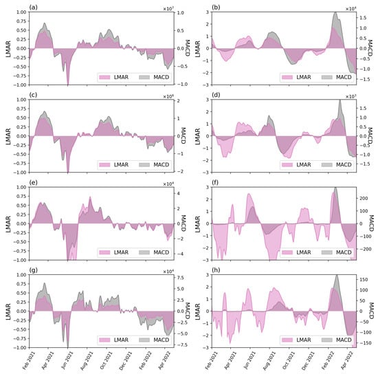 The LMAR (magenta) and MACD (grey) of the check-in counts (left) and new case counts (right column) for the country (top row, (a,b)) and three selected states: (2nd row, (c,d)) Kuala Lumpur, (3rd row, (e,f)) Labuan, and (4th row (g,h)) Perlis.