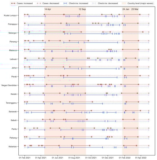 This study aims to identify the waves of disease and human activity intensity in Malaysia. This study focuses on two objectives: (1) to demonstrate how the waves of the disease cases and the check-ins can be identified, and (2) if there is a relationship between the disease situation and human activity intensity. Previous studies showed that human activity intensity and disease cases were positively correlated [,,]. This means that when a place has a higher intensity of human activity, it may lead to a more serious outbreak. However, from the time series analysis perspective, a time lag must exist between the human activity intensity and the outbreak. During an outbreak of the disease, government-imposed movement restrictions or self-imposed travel willingness would reduce human activity intensity. This indicated that the outbreak would be followed by a reduction in human activity intensity as well [,]. Therefore, we would explore the patterns of the disease cases and the check-ins to uncover the relationship between the two sets of time series.