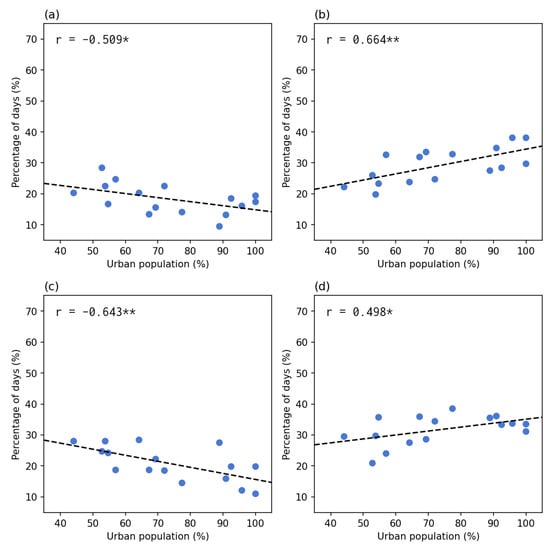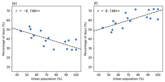 The percentage of days in each of the four groups and the two subtotal groups compared to the percentage of the urbanized population. The left column shows the same direction groups: (a) up–up, (c) down–down), and (e) the subtotal of the same directions. The right column shows the opposite direction groups: (b) up–down, (d) down–up, and (f) the subtotal of opposite directions. Each point indicates a state or federal territory. The correlations were significant at either (*) level or (**) level.