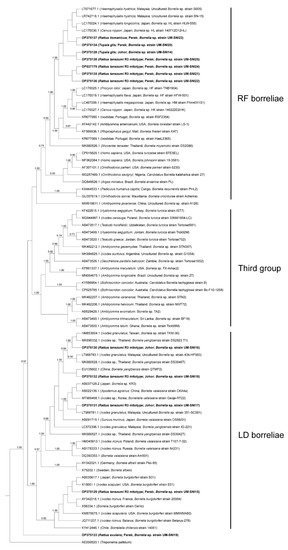 A closer observation of the RF borreliae obtained from this study suggested that they form a sister clade independent of the other RF borreliae strains. This clade includes the unculturable Borrelia spp. detected in Malaysia (Accession nos. LT671677.1 and LR742718.1) and Japan (Accession nos. LC170024.1 and LC170030.1) (Figure 2). Conversely, the LD borreliae topology showed that most of our specimens clustered with Borrelia yangtzensis and Borrelia valaisiana genospecies group members reported from other Asian countries.