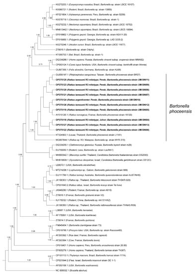 - Blasdell, K.R.; Perera, D.; Firth, C. High prevalence of rodent-borne Bartonella spp. in urbanizing environments in Sarawak, Malaysian Borneo. Am. J. Trop. Med. Hyg. 2019, 100, 506–509. [Google Scholar] [CrossRef]