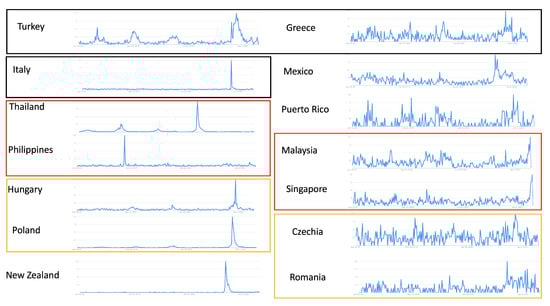 Google Trends of countries with limited surveillance: using the same keyword “RSV”, countries with clear patterns are listed on the (left). Countries without clear patterns are listed on the (right). Countries that are close to each other geographically are boxed in the same color.