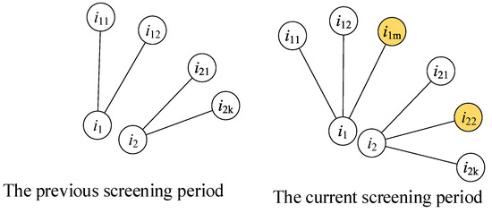 The metric is calculated according to the contact numbers of a person before and during the current screening periods, as shown in Figure 2, and expresses the new contact numbers of a person during the current screening period. The contact persons and are the new contact people of the two individuals and , respectively, and both values of the two people are 1.