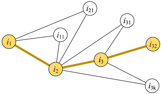 The nodes’ global influence can be presented by their effects on multiple order nodes. Similarly, the global influence of an infected person is higher if the person can infect more individuals through multiple connections [37]. Based on this idea, we propose the long-line screening mode. As shown in Figure 3, the essential idea behind the long-line screening mode is to select the connected person who has the largest individual infection risk at each connection level. First, we should determine which contact line should have priority selection. All people are sorted according to individual infection risks, and the person with a larger individual infection risk will be selected as the source person (i1) of the screening. Then, the next person () will be selected from the contact persons of the source person (i1). The contact person who has the most noncommon neighbors with the source person (i1) will be selected. The contact person who has the most non-common neighbors could infect more people who are not in contact with the source person (i1); this type of contact person has a higher hub influence on the source person (i1) and the neighbors of the contact person (). The next selected person () will be selected in the same way until there is no next contact person to be selected in this contact line. The priority is to detect the above-selected people in multiple connections.