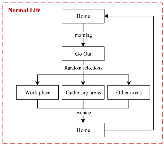 In our model, people who do not have symptoms of infection would continue their normal life. In the normal life of one person, three typical characteristics are designed: (a) a person may leave home in the morning or choose to stay home; (b) a person will go home in the evening if this person is outside; and (c) the daily travel range of a person includes workplaces, gathering areas, and residential zones. The flowchart of a person living their normal life is illustrated in Figure 4.
